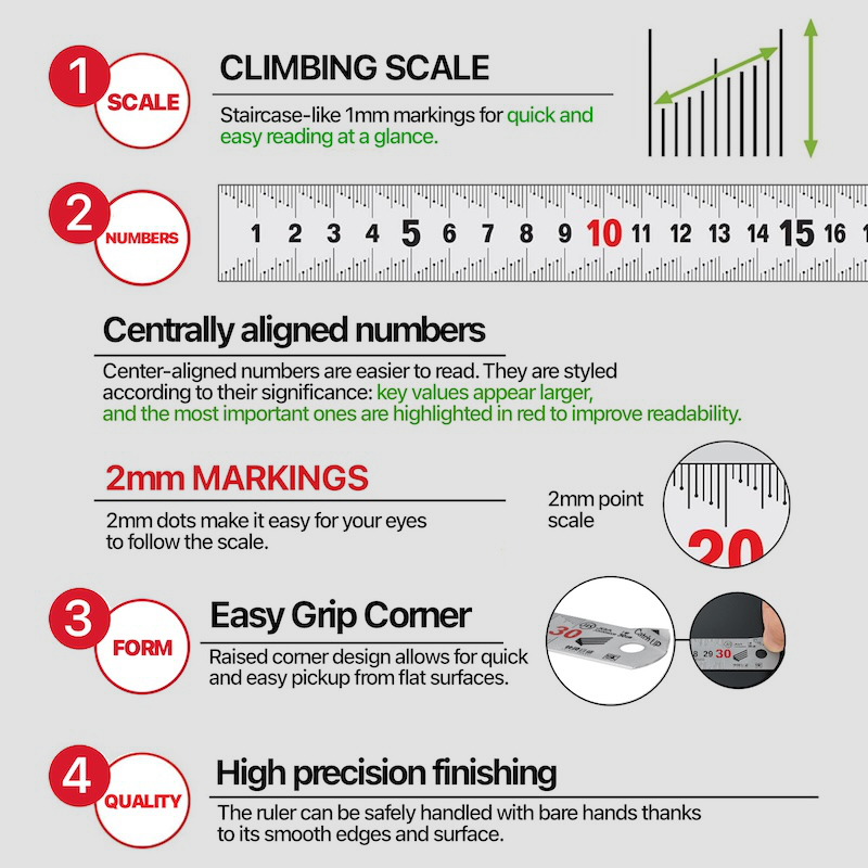 Precise and elegant, the Niigata Seiki 150mm Stainless Steel Ruler is made in Japan for professionals. This ruler features distinct staircase-like 1mm markings that allow for quick and easy reading at a glance.2mm dot indicators guide your eyes smoothly along the scale, enhancing readability and reducing visual fatigue during detailed work. The raised corner makes it easy to pick up from flat surfaces—no more fumbling at your workspace.Made from high-grade stainless steel, this 300mm ruler offers durability, corrosion resistance, and lasting performance for engineers, designers, crafters, and students.