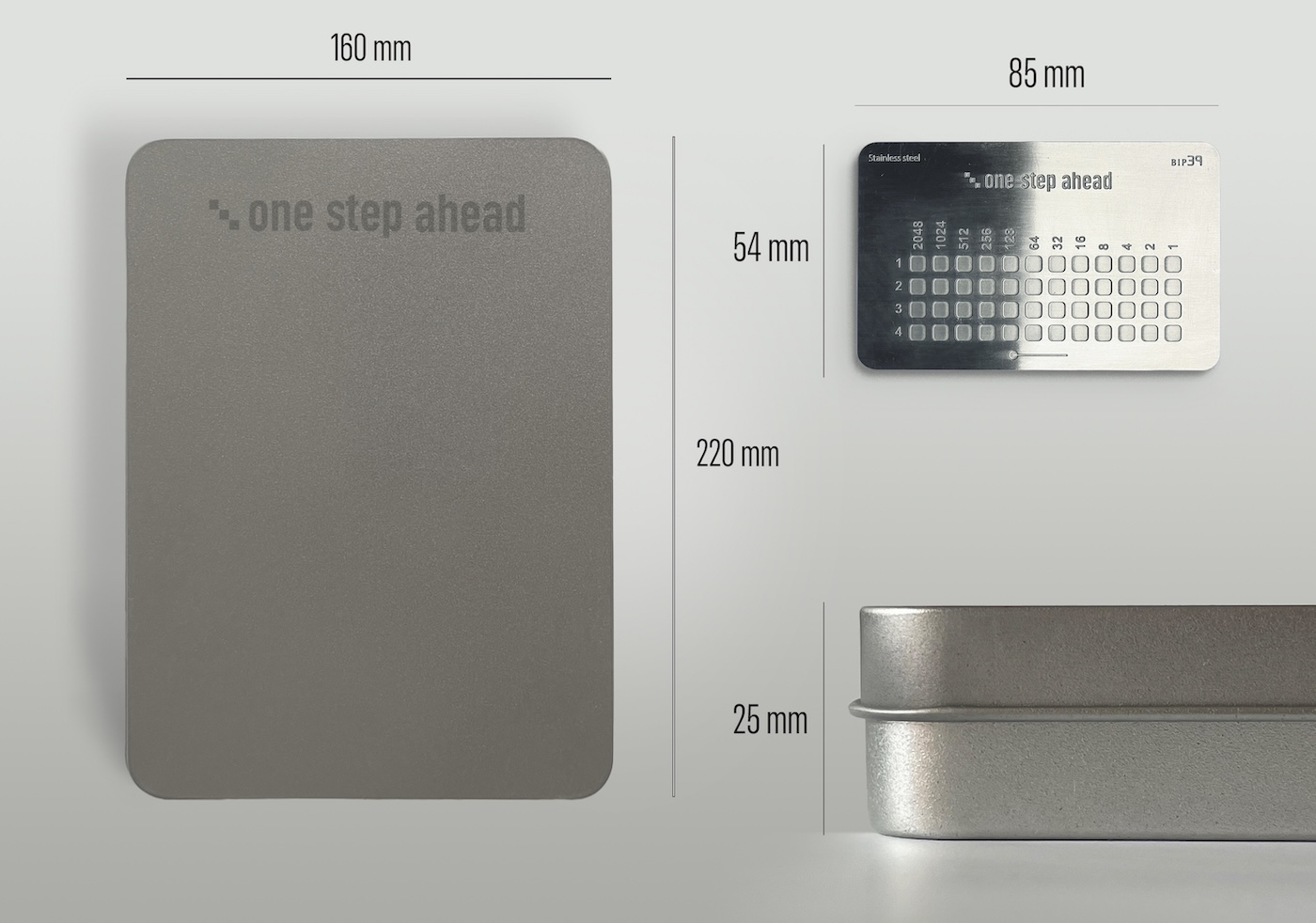 This Smart Metal Seed Box is ideal for protecting a 12-word seed phrase for digital wallets. It allows you to utilise our key solution, the smart split (3-by-2) method. You can effectively split your mnemonic phrase and protect it on three separate metal plates.